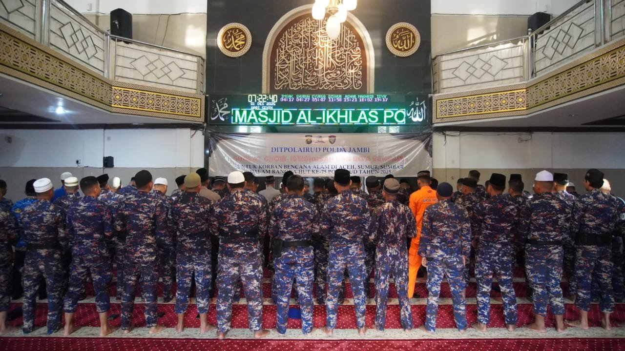 RJNews.co.id – Dalam rangka memperingati HUT ke-75 Polairud tahun 2025, Ditpolairud Polda Jambi melaksanakan Sholat Ghaib, Istighosah, dan Doa Bersama di Masjid Al-Ikhlas Polda Jambi, sebagai bentuk empati atas musibah bencana alam yang menimpa wilayah Aceh, Sumatera Utara, dan Sumatera Barat. (01/12/25)