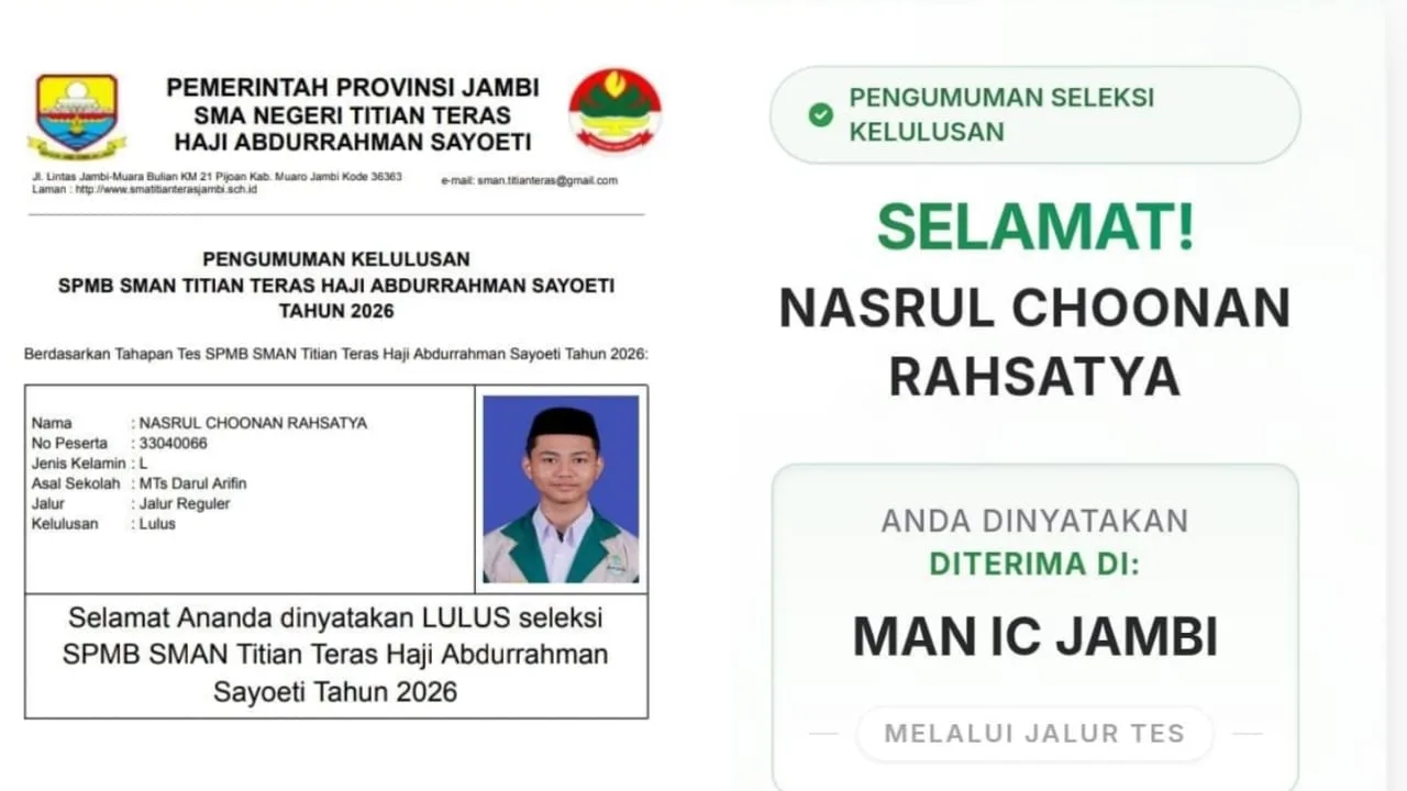 Pengumuman kelulusan SMA Titian Teras Jambi disampaikan pada 5 Maret 2026, sementara hasil seleksi MAN Insan Cendekia Jambi diumumkan pada 6 Maret 2026.