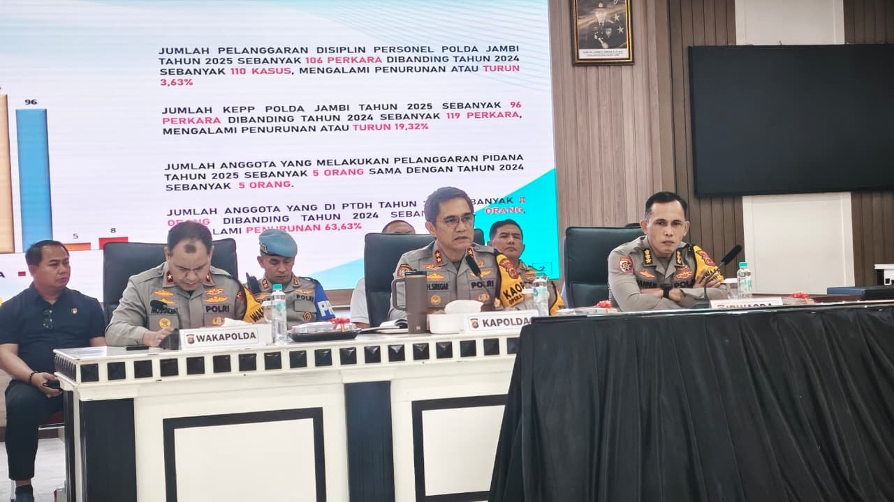 Bidang Profesi dan Pengamanan (Bid Propam) Polda Jambi mencatat penanganan 110 perkara pelanggaran disiplin sepanjang 2025. Angka tersebut menurun dibandingkan tahun 2024. Pelanggaran yang ditangani meliputi kasus perilaku, permasalahan rumah tangga, narkotika, serta pelanggaran disiplin lainnya.
